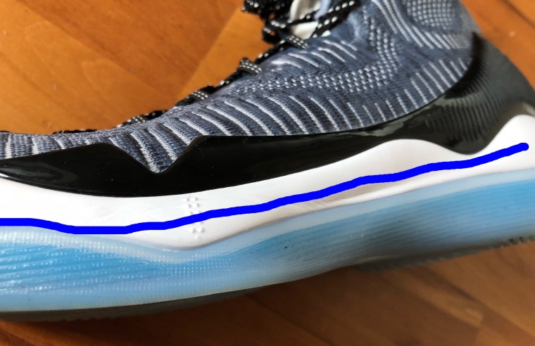 KT2’s cushion works slightly above average for me. The 2 crush pads in the forefoot and heel areas work pretty well, but the midsole itself is made of a fairly dense foam. It’s really stiff and heavy. In fact the whole shoe is super stiff from top to bottom, and it requires a long break-in period. Unlike other typical Chinese bball shoes, KT2’s heel to toe offset is actually very small. Feels like sub-6MM drop running shoes. Here’s a picture of the midsole: http://review.fastpass.cn/wp-content/uploads/2017/06/11731101-4-103.jpg